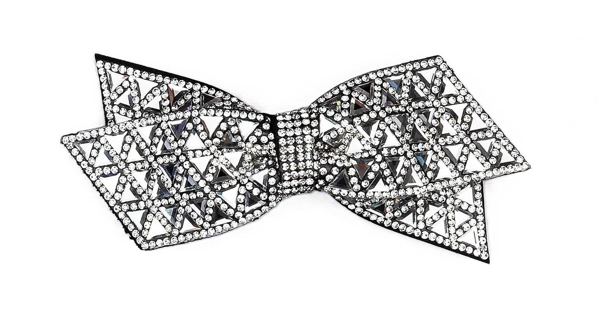 Fermaglio a forma di fiocco dalla forma geometrica, interamente ricoperto di strass .