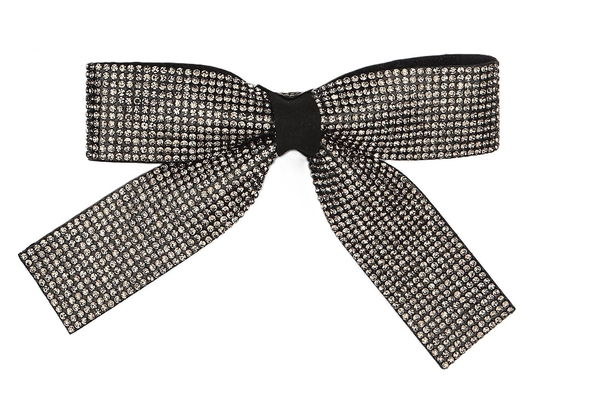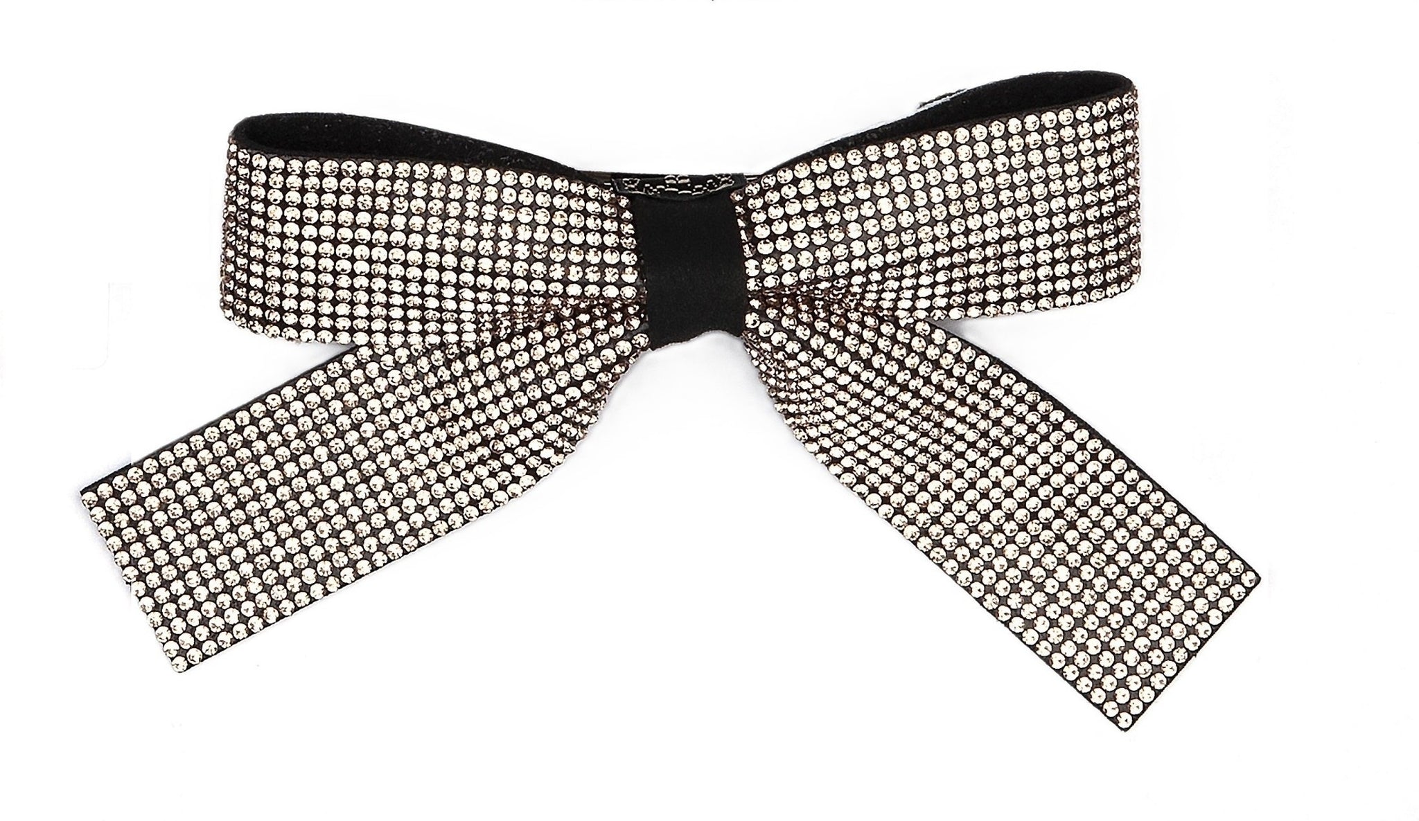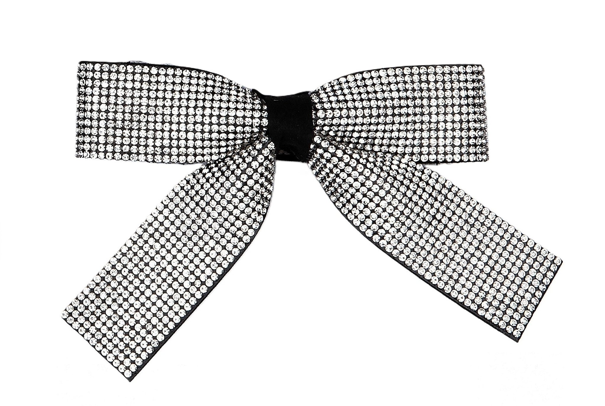 Fermaglio a forma di fiocco con code, interamente ricoperto di strass.