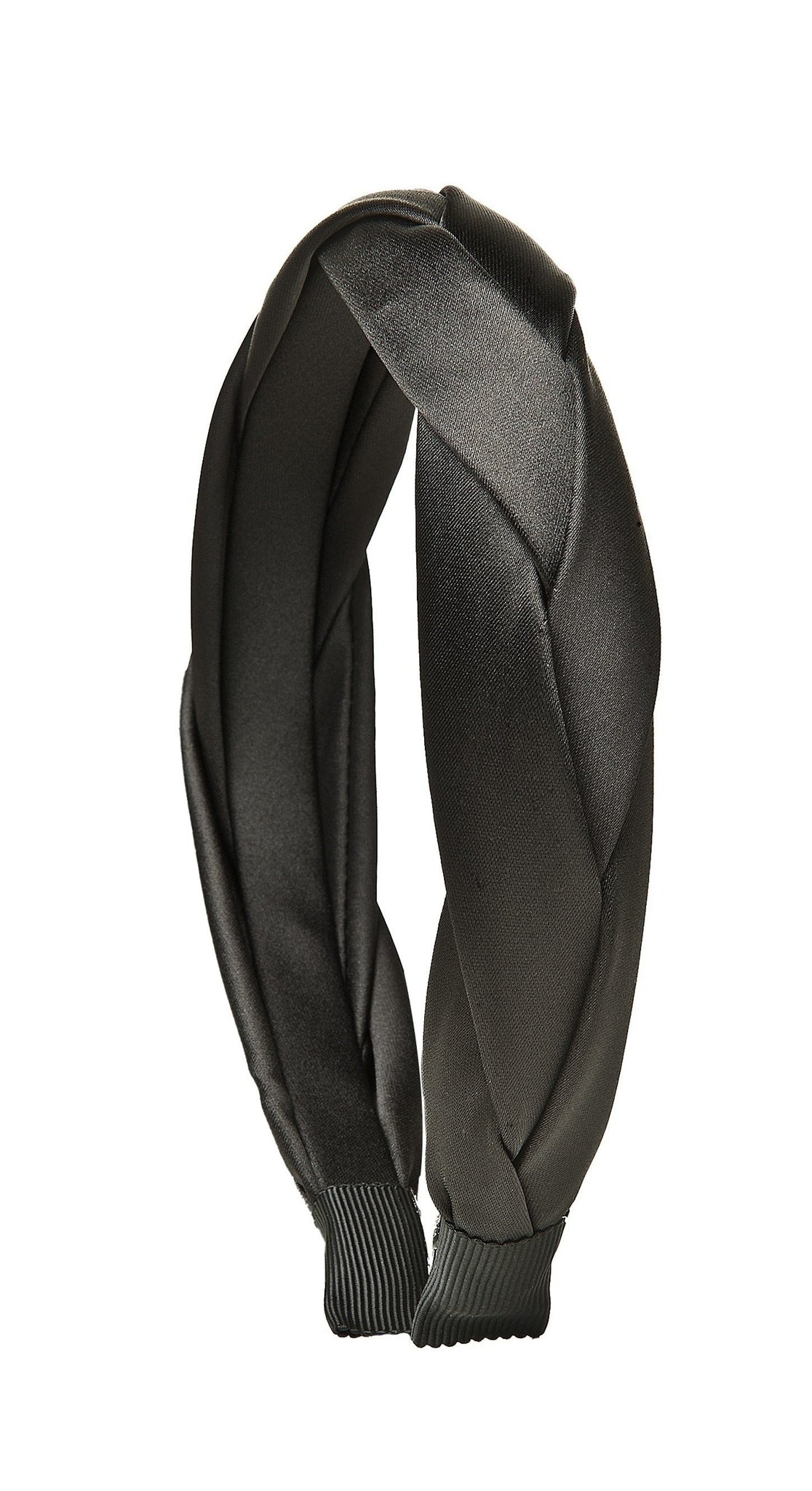 Raffinato cerchietto intrecciato, in elegante tessuto satin lucido.  La parte interna è completamente rivestita con lo stesso materiale.